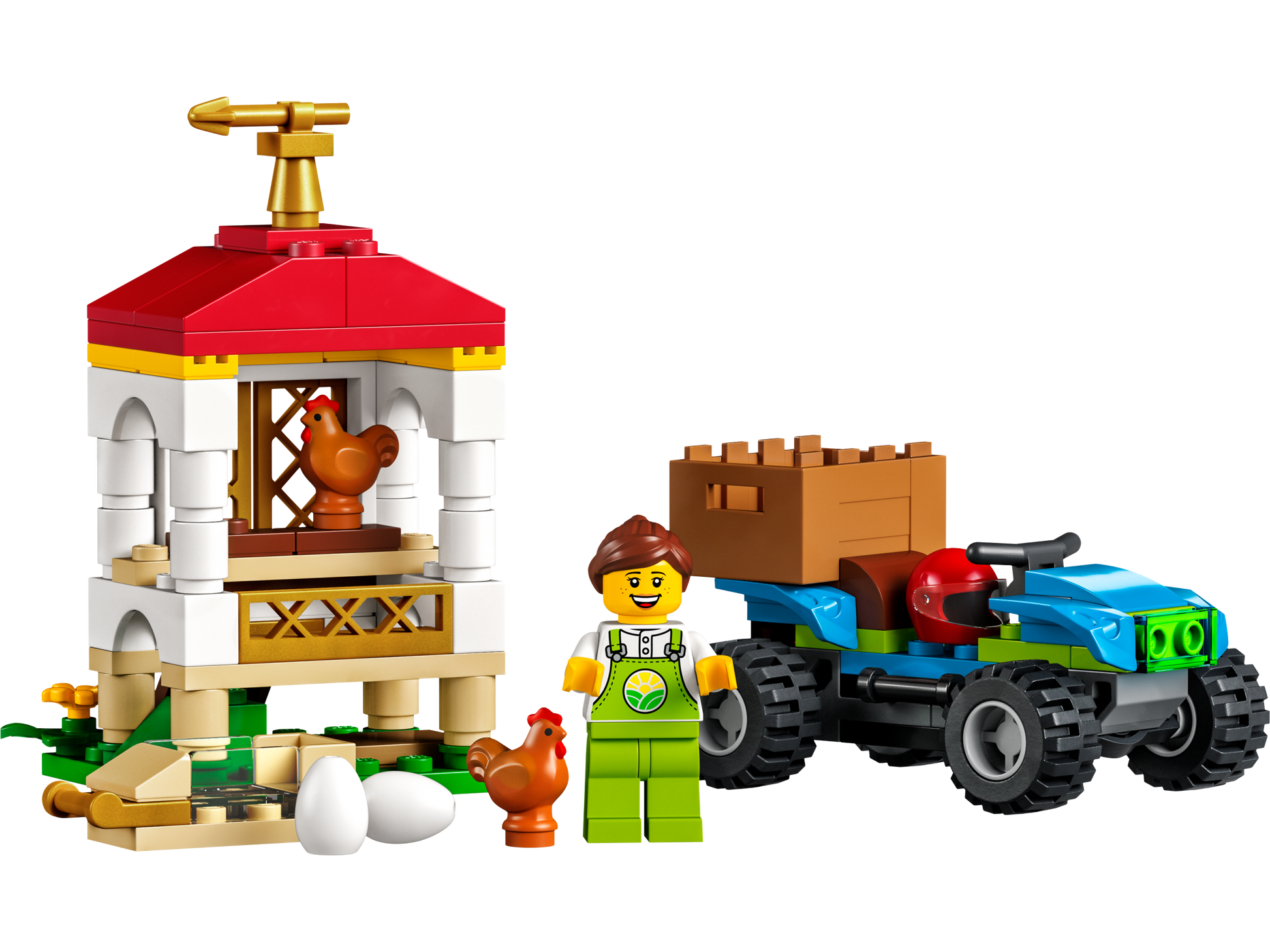 - What’s in the box? – Everything kids need to create a toy Chicken Henhouse, an ATV with tilt-to-turn functionality, plus a farmer minifigure, 2 chicken figures and accessories including 2 eggs