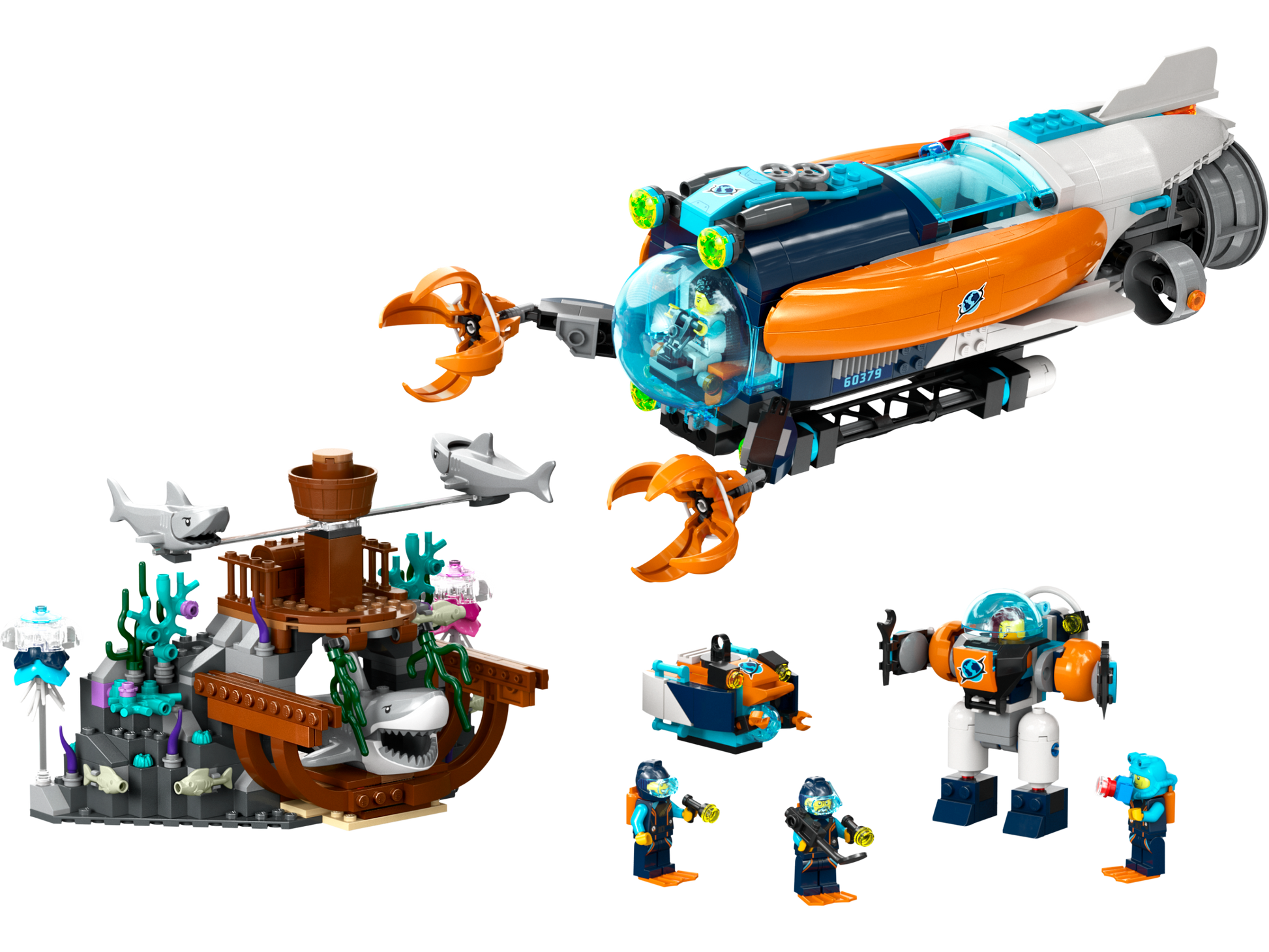What's in the box? – All kids need to build a deep-sea submarine, drone, diving suit, shipwreck setting and 6 explorer minifigures, plus 1 skeleton, 3 shark, 2 jellyfish and 4 fish figures