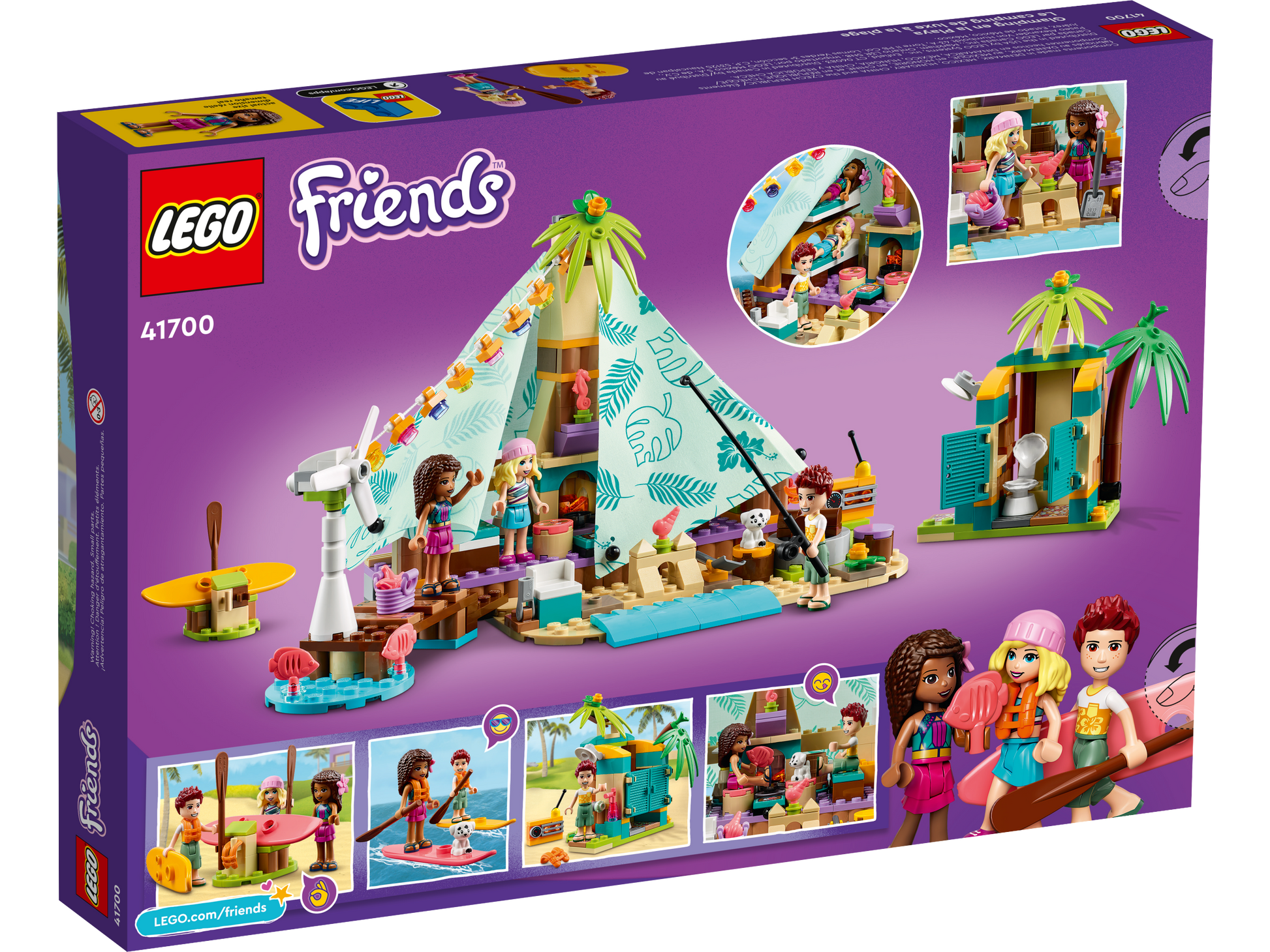 • Camp in style – LEGO® Friends Beach Glamping (41700) includes 3 mini-doll characters, a puppy figure, tent with bunk beds, stove and fabric cover, plus a spinning wind turbine to power the lights