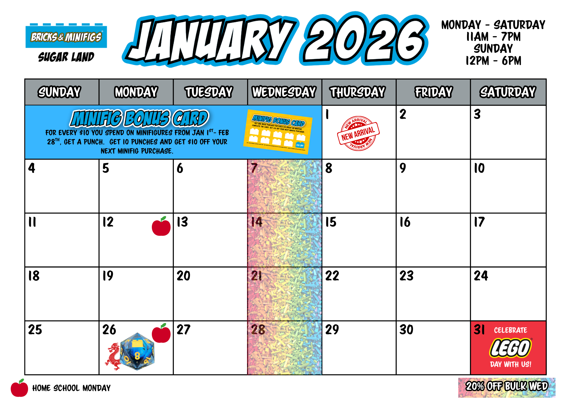 🧱 Minifig Bonus Card Promotion January 1–February 28 – For every $10 you spend on minifigures, get a punch! Collect 10 punches and receive $10 OFF your next minifig purchase. It’s a win-win for minifig fans!
