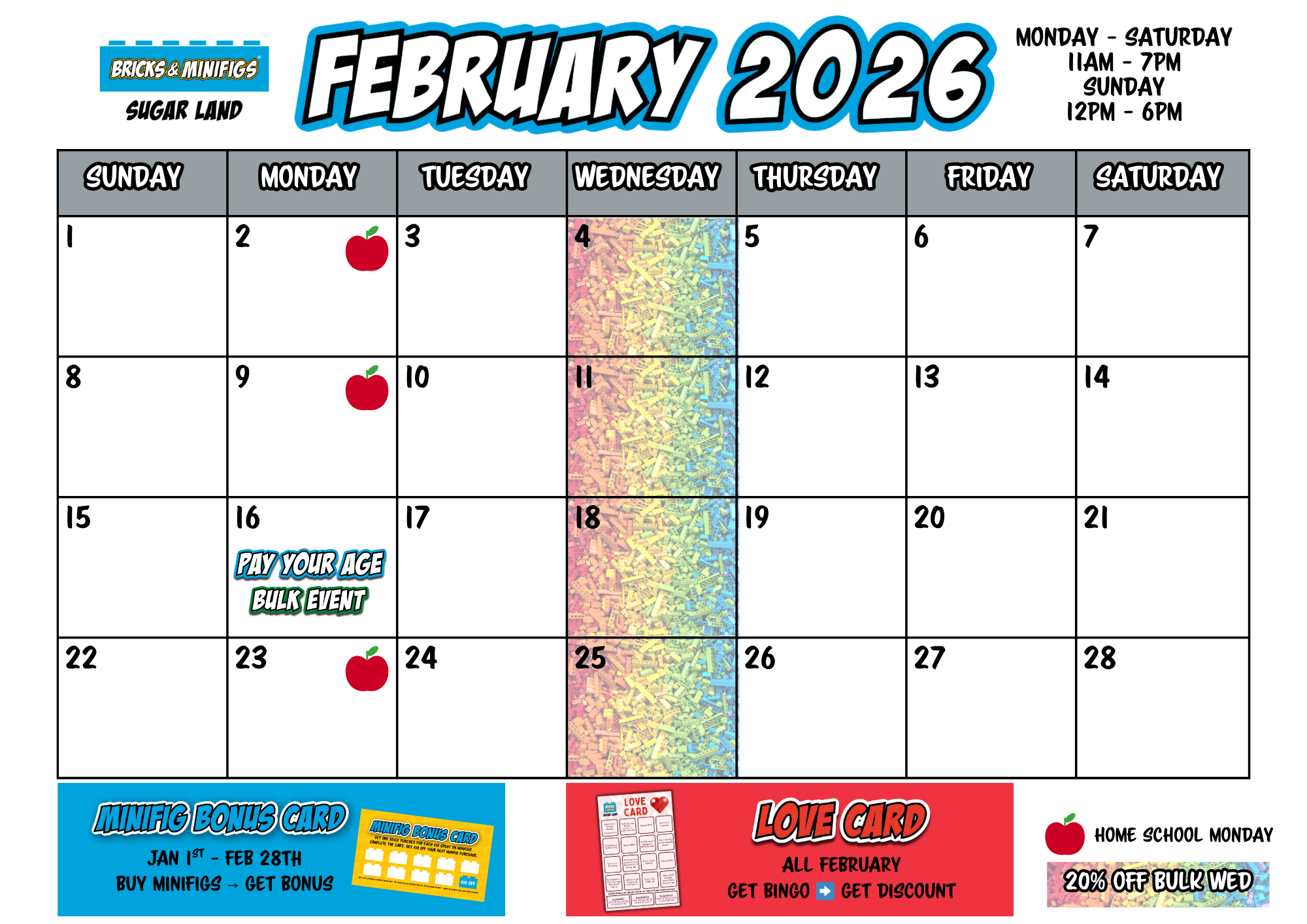LOVE CARD – Celebrate February with our LOVE CARD loyalty challenge—complete fun tasks, earn stamps, and unlock up to 30% off minifigs and pre-built sets at Bricks & Minifigs Sugar Land!