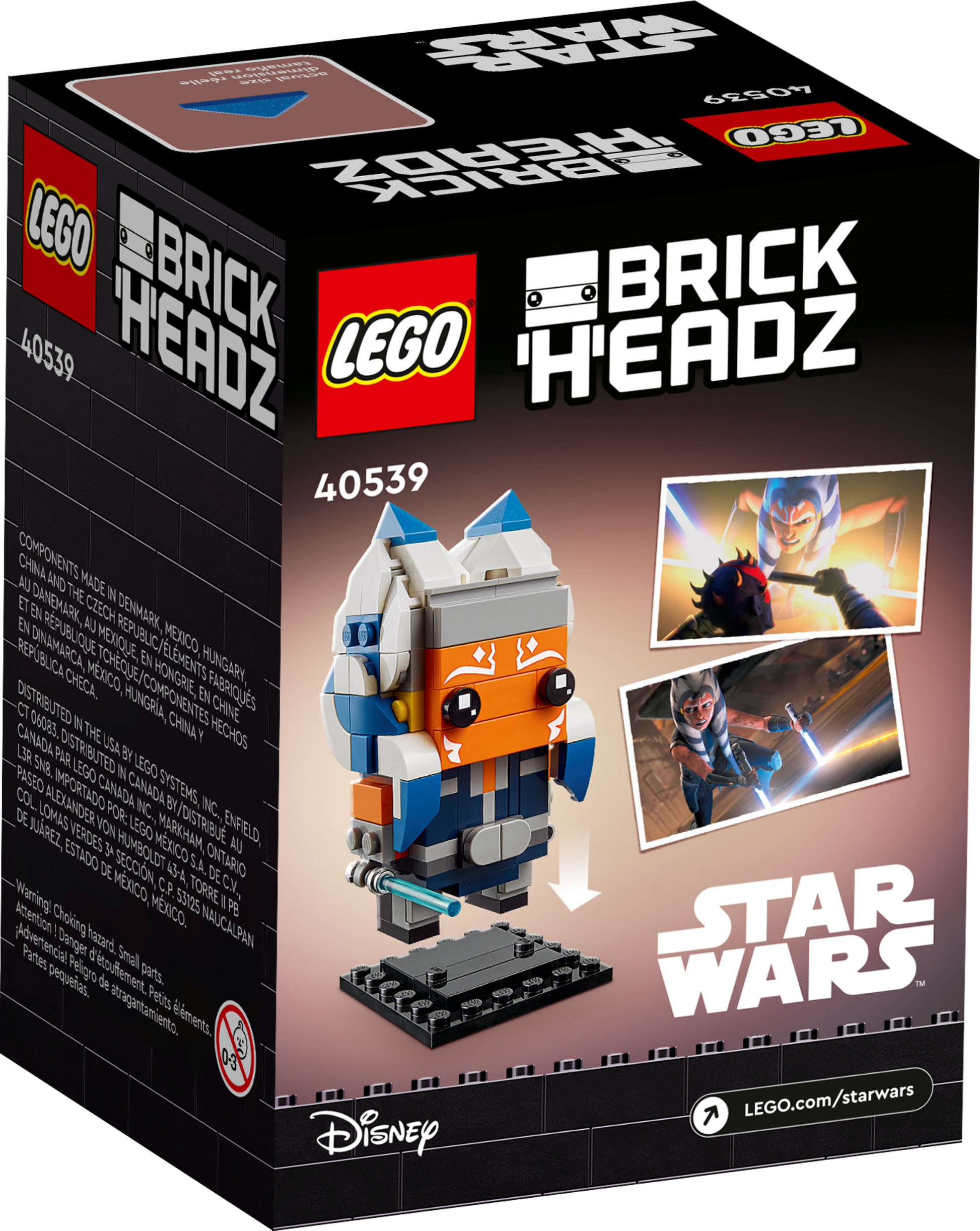 - Ahsoka Tano in LEGO® BrickHeadz™ style – A buildable LEGO BrickHeadz figure of Jedi hero Ahsoka Tano (40539) in a Star Wars: The Clone Wars outfit with 2 blue lightsabers