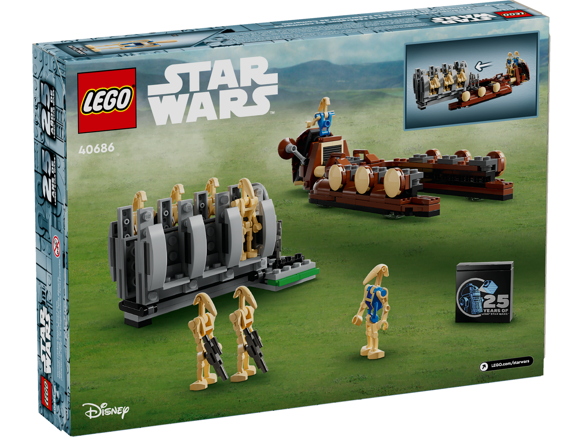 Create a Trade Federation Troop Carrier (40686) to mark the 25th anniversary of Star Wars: The Phantom Menace and LEGO® Star Wars™ sets. This buildable Star Wars vehicle for adults has space for 2 Pilot Battle Droid LEGO figures and 6 Battle Droids, who fit on the rear rack, ready for the Battle of Naboo. The rack slides out and unfolds, just like in Star Wars: The Phantom Menace, and can store the Battle Droids’ blasters. A LEGO Star Wars 25th anniversary brick completes an epic centerpiece.