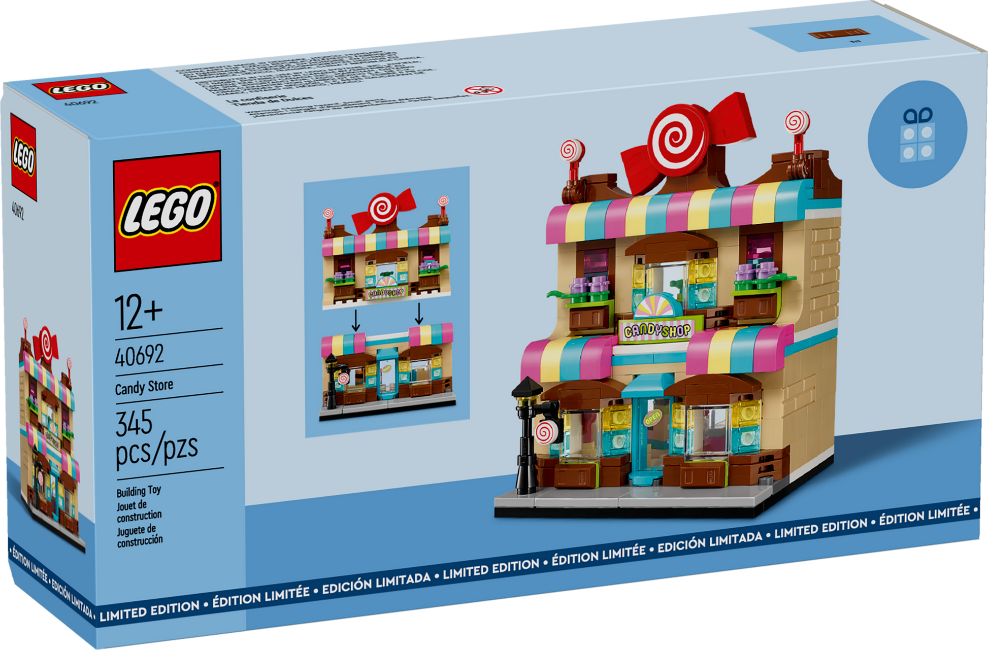 - Dimensions – The 345-piece LEGO® Candy Store measures over 5 in. (13 cm) high, 3.5 in. (9 cm) wide and 3 in. (8 cm) deep