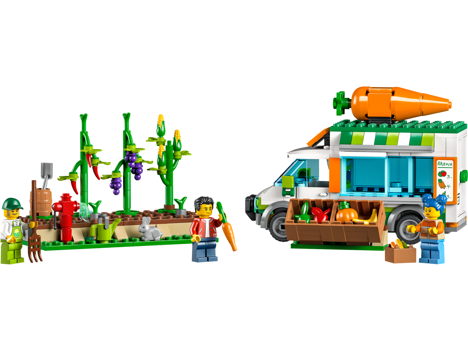 - What’s in the box? – All kids need to build a mobile farm shop and veggie patch, with lots of play-inspiring features, plus 3 minifigures, including a LEGO® City TV character, and a rabbit figure
