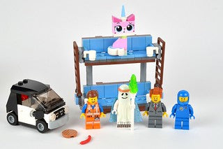 Celebrate everyone being friends again by building THE LEGO® MOVIE™ Double-Decker Couch! Emmet’s iconic invention features cup holders with removable cups and flip-up ladders at either end. Park Emmet’s car nearby and join the others. Sit with Unikitty, grab a tasty waffle with Emmet, enjoy a giant sausage with Benny… and even have a chat with super-friendly President Business! This set includes a glow-in-the-dark Ghost Vitruvius minifigure (new for spring 2015), cool updated versions of all other characters and an extra face expression for Unikitty. Everything is awesome, so enjoy! Includes 4 minifigures with accessories: Emmet, Benny, President Business and Ghost Vitruvius, plus a Unikitty (sitting version) figure.