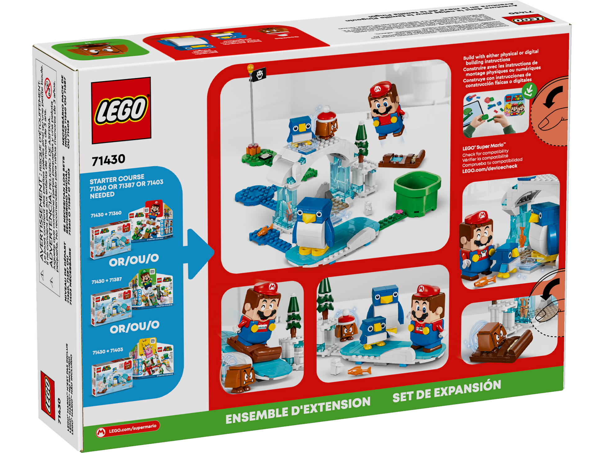 Role-play and create a fun-packed level with the LEGO® Super Mario™ Penguin Family Snow Adventure Expansion Set (71430). This building toy for kids aged 7 and up features 3 Super Mario™ characters – a LEGO® brick-built penguin, a baby penguin and a Goomba figure with a winter hat – plus a buildable ice cave, an ’ice’ slide that converts into a skating rink, 2 fish figures and a sled to inspire creative play. For interactive play, add a LEGO® Mario™, LEGO® Luigi™ or LEGO® Peach™ figure from a LEGO Super Mario interactive set (71439, 71440 or 71441 – each sold separately) and earn digital coins for reuniting the baby penguin with its parent, defeating the Goomba, and more. A fun gift for gamers, this set is complemented by the LEGO Super Mario app. Download the app for building instructions, imaginative ideas for different ways to build and play and a safe forum for children to share their creations with fellow fans.