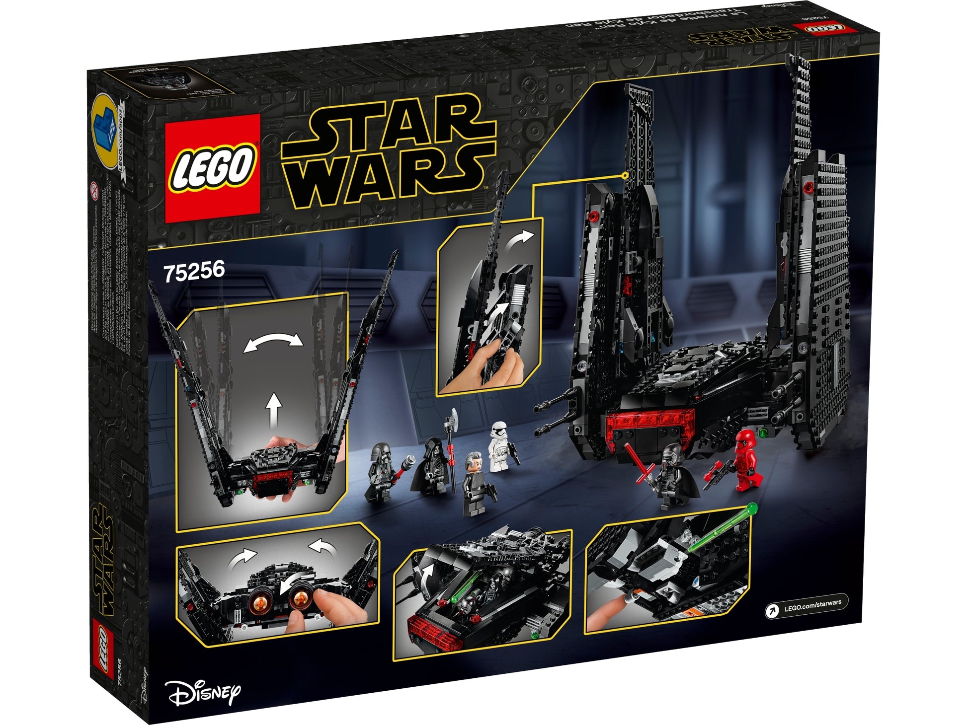 - Kylo Ren’s command shuttle features rotatable right engine for folding in the wings when landing, the ability to shorten the wings by folding the top part down, 2 spring-loaded shooters, lowering access ramp and a 3-minifigure cockpit.